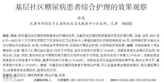 参考资料:[1]徐园.基层社区糖尿病患者综合护理的效果观察[J].中国城乡企业卫生,2025,40(04):228-230.